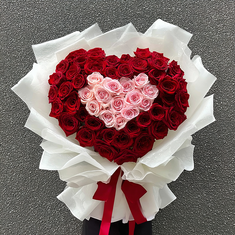 This bouquet is the embodiment of love. Red roses blaze like passionate flames, embraced by the tenderness of pink roses, together forming the shape of a heart. White wrapping paper, like clouds’ pure garment, holds the overflowing fragrance, while a red ribbon ties a knot of deep affection, capturing intense love and delicate softness within this bouquet. When the gaze meets it, one falls into a swirl of red and pink, where even the air is filled with sweet whispers, telling an eternal confession: "With heart as the letter, I gift you the entire universe of romance."